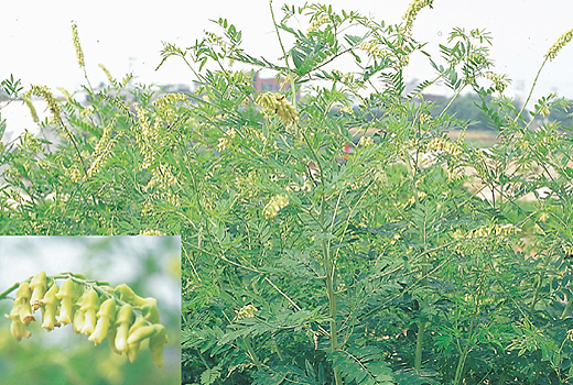 □ 다년생 초본으로 키 1m에 달하고 뿌리는 비대하며 황색이다. 잎은 기수우상복엽이 호생하며 소엽 은 타원상 피침형이다. 총상화서는 줄기위의 가지 끝에 정생하고 꽃은 담황백색이며 꽃잎은 나비모양 이다. 꼬투리는 선형이며 끝에 긴 부리가 있고 종자는 흑색 구형이다.