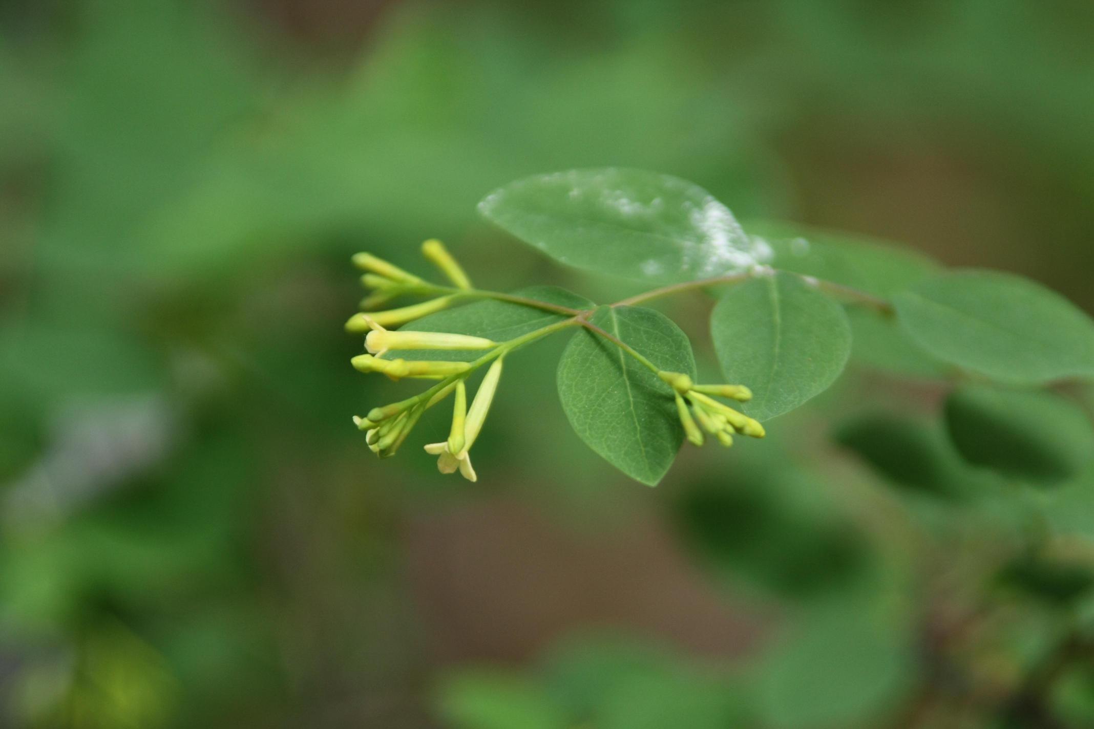 잎은 마주나기하며 긴 타원상 달걀형으로 톱니가 없다. 잎 양면에 털이 없으며 표면은 연두색이고 뒷면은 회녹색이다.